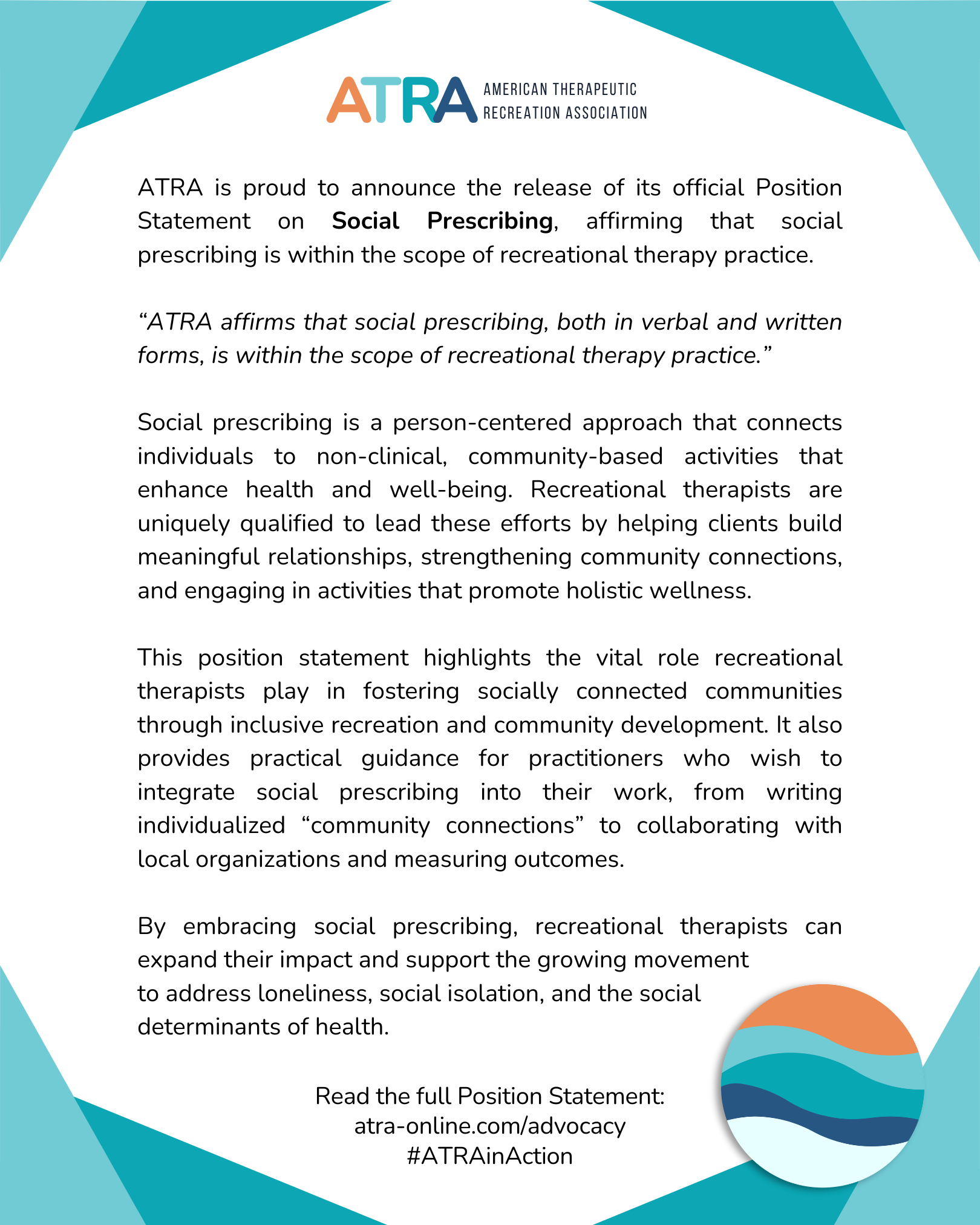 “ATRA affirms that social prescribing, both in verbal and written forms, is within the scope of recreational therapy practice.”